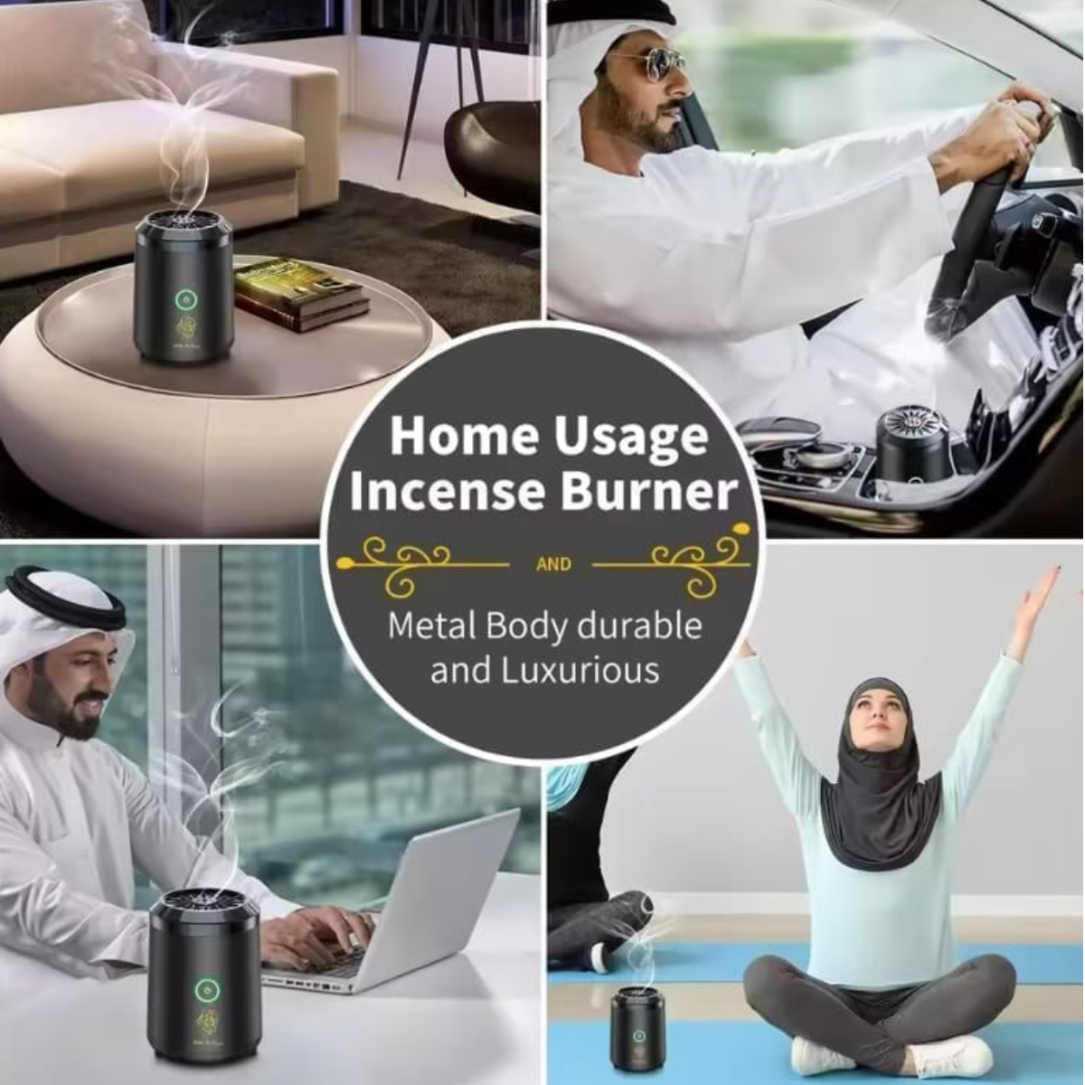 Elevate your space with the timeless scent of oud using this Electric Bukhoor Burner. Designed with modern convenience in mind, it features a USB rechargeable battery and flameless heating, making it perfect for safe, clean use—no charcoal or open flame required. Whether you're at home, in your car, on the go, or even out desert camping, this compact diffuser delivers rich, lasting fragrance wherever you are.